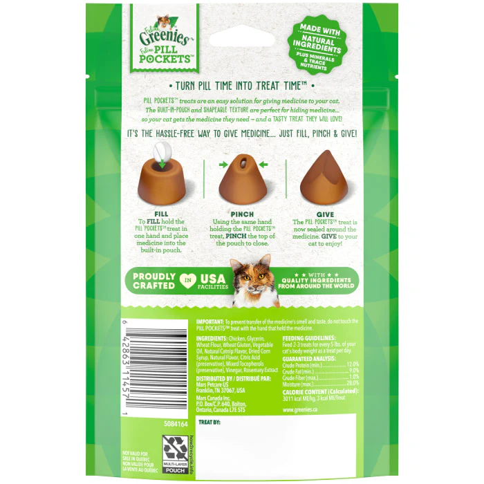 Take the stress out of giving your cat their medicine. FELINE GREENIES PILL POCKETS Treats for Cats easily hide most tablet-sized and capsule-sized pills in a great-tasting meaty treat thatās made with natural ingredients plus minerals and trace nutrients. These soft cat treats are the #1 vet recommended choice for giving pills* and feature a delicious catnip flavor that helps disguise the taste of the medicine. It's the hassle-free way to give your cat medicine... just place their medicine inside the pocket, pinch the pocket closed to secure the pill or capsule, and share with your cat. Just like that, the treat (and medicine) disappears. When it comes to taking meds, your cat is smart. But you're smarter... because you've got FELINE GREENIES PILL POCKETS Cat Treats.