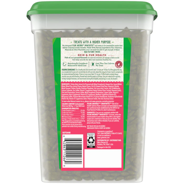 FELINE GREENIES SMARTBITES Skin & Fur Health Crunchy and Soft Natural Cat Treats, Salmon Flavor, 16 oz. Tub