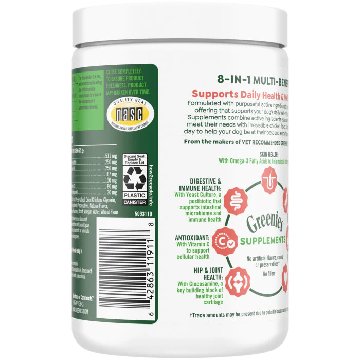From the makers of veterinarian-recommended Greenies Dental Treats, Greenies Supplements 8-in-1 Multi-Benefit is formulated with purposeful, science-backed active ingredients to support your dogās daily well-being. This dog supplement supports hip and joint health, digestive health, skin health, immune health, vitality, heart health, urinary health, and includes an antioxidant to support cellular health. Your four-legged friend will enjoy the irresistible chicken flavor, formulated without artificial flavors, colors, or preservatives. Simply give once a day to help your dog be at their best and enjoy happy days together.