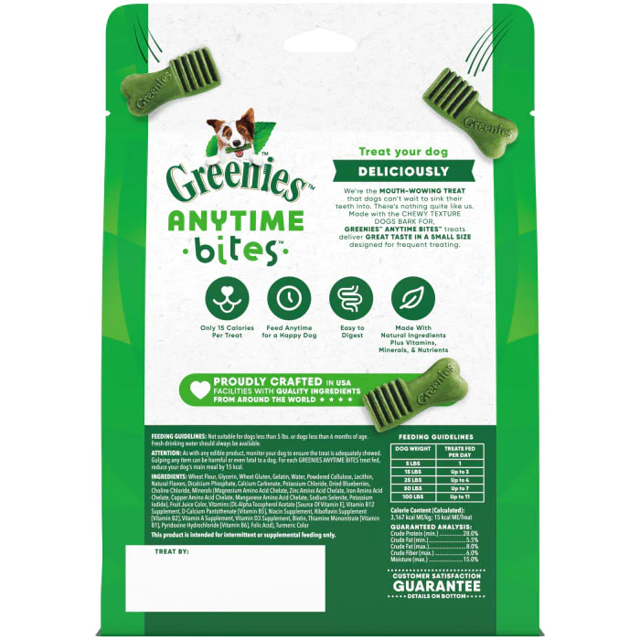 GREENIES ANYTIME BITES are chewy dog treats that are small in size but big in flavor. Specially designed for frequent treating, these Blueberry Flavor dog treats have an irresistible taste your dog is sure to shake (or roll over) for. Each dog treat is only 15 calories, making them a great option for frequent treating. So whether you’re looking for training treats or simply a snack to treat your dog with, GREENIES ANYTIME BITES are easy to digest and made with natural ingredients plus vitamins, minerals and nutrients. Your dog will love the chewy texture of these dog treats, and you’ll love knowing that these dog treats are crafted in USA facilities with quality ingredients from around the world. Simply feed any time for a happy dog.