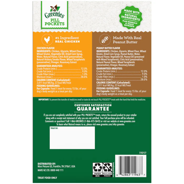 Greenies Pill Pockets Treats for Dogs make it easy to give medicine to your dog, with tasty chicken flavor or peanut butter flavor they're sure to love. Why hide your pet's medicine in human foods like cheese when you can give them to your dog in a treat designed to make giving pills a hassle-free experience for you and your dog? Greenies Pill Pockets treats mask the taste of medicine and have a built-in pouch perfect for hiding medicine. Whether for large breed or small breed dogs, these tasty treats make taking medicine a positive experience for your dog. And they're easy to give: Simply drop the medicine capsule into the treat pouch, pinch the top half closed, give to your dog and poof: watch the medicine disappear. Greenies Pill Pockets treats are the ingenious way to give your dog their meds - and they may never know the difference.