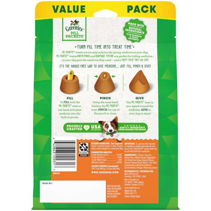 Turn pill time into treat time! Greenies Pill Pockets Treats are the #1 veterinarian-recommended choice for giving pills, based on a survey of US Veterinarians. Why hide your pet’s medicine in human foods like peanut butter or cheese when you can give them a dog treat made with natural ingredients plus minerals and trace nutrients? Greenies Pill Pockets Cheese Flavor Dog Treats are made with real cheese and take the hassle out of giving your canine companion medicine. Whether for large breeds or small dogs, these large-sized capsule Pill Pockets make taking medicine a positive experience for your dog. And they’re easy to give: Drop a capsule into the large Pill Pocket dog treat, pinch the top to close, give it to your dog, and watch their medicine disappear. Greenies Pill Pockets dog treats are the easy way to give your dog their meds—and they’ll never know the difference.