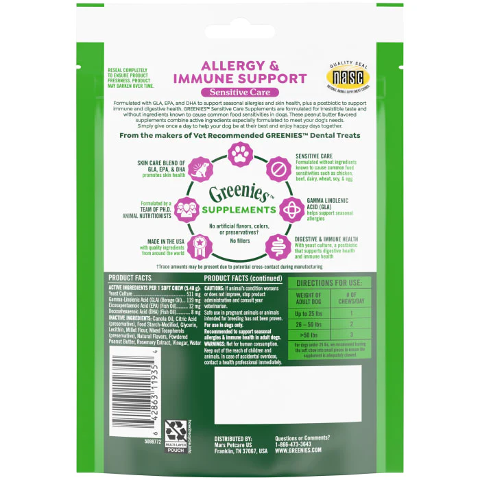 From the makers of veterinarian-recommended Greenies Dental Treats, Greenies Allergy & Immune Support Sensitive Care Supplement for Dogs is specially formulated without ingredients known to cause common food sensitivities in dogs (such as beef, dairy, wheat, lamb, egg, chicken, and soy). These supplements are formulated with GLA, EPA, and DHA to support seasonal allergies and skin health. Greenies Supplements Allergy & Immune Support Sensitive Care also supports gut health and immune health with yeast culture, a postbiotic. This daily soft chew is made with real peanut butter for an irresistible taste. Greenies Supplements Allergy & Immune Support Sensitive Care are formulated without artificial flavors, colors, or preservatives, and has the National Animal Supplement Council (NASC) quality seal. Simply give once a day to help your dog be at their best and enjoy happy days together.