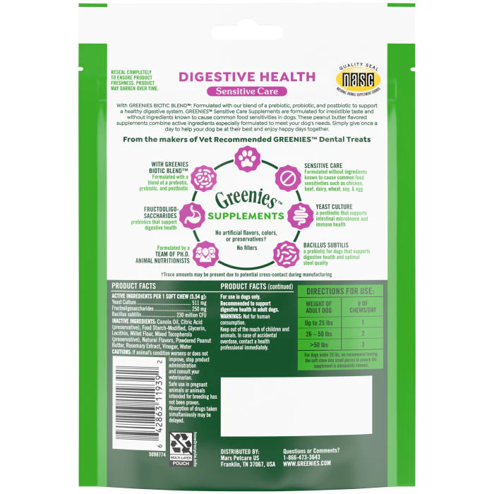From the makers of veterinarian-recommended Greenies Dental Treats, Greenies Digestive Health Sensitive Care Supplement for Dogs is specially formulated without ingredients known to cause common food sensitivities in dogs (such as beef, dairy, wheat, lamb, egg, chicken, and soy). These supplements are formulated with a blend of a prebiotic, postbiotic, and probiotic for dogs to support a healthy digestive system. Greenies Supplements Digestive Health Sensitive Care also supports gut health and optimal stool quality. This daily soft chew is made with real peanut butter for an irresistible taste. Greenies Supplements Sensitive Care are formulated without artificial flavors, colors, or preservatives, and has the National Animal Supplement Council (NASC) quality seal. Simply give once a day to help your dog be at their best and enjoy happy days together.