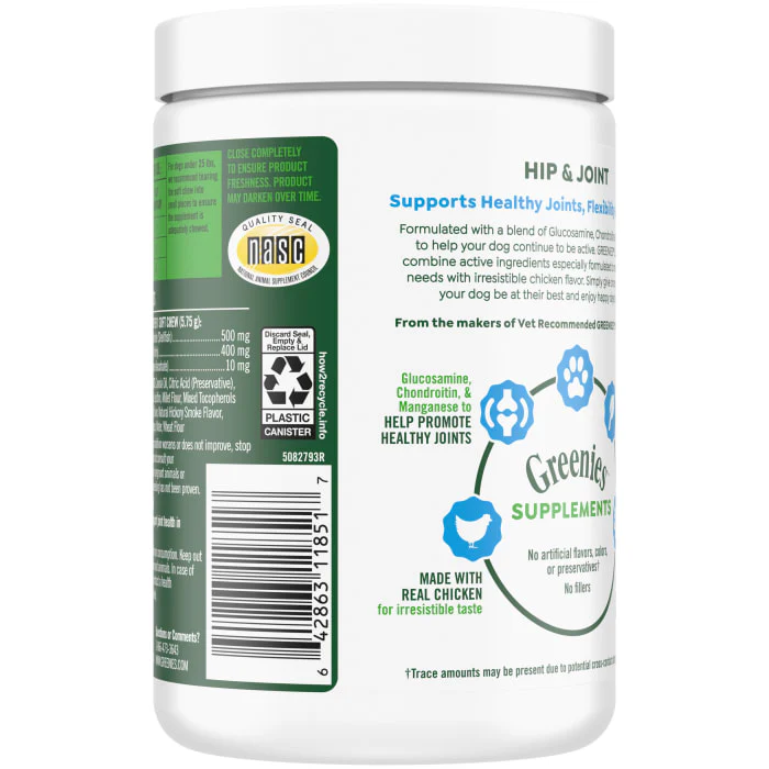From the makers of veterinarian-recommended GREENIES Dental Treats, GREENIES Supplements make it easy to support your dog's health. Supplement your dog's joint health with GREENIES Hip & Joint Supplements, formulated by a team of Ph.D. Animal Nutritionists to support healthy joints, flexibility and mobility. Made for adult dogs of all sizes, GREENIES Hip & Joint Supplement contains active ingredients Glucosamine, Chondroitin and Manganese to help your dog continue to be active. These soft chews are made with real chicken for irresistible taste and are formulated without artificial flavors, colors or preservatives and no fillers. Plus, they are made in the USA with quality ingredients from around the world and contain the National Animal Supplements Council Quality Seal. Simply give once a day to help your dog be at their best and enjoy happy days together.