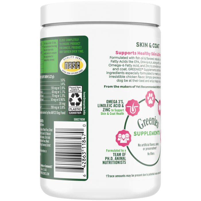 From the makers of veterinarian-recommended GREENIES dental treats, GREENIES Supplements make it easy to support your dog's health. Supplement your dog's skin and coat health with GREENIES Skin & Coat Supplements, formulated by a team of Ph.D. Animal Nutritionists to support healthy skin and shiny coat. Made for adult dogs of all sizes, GREENIES Skin & Coat Supplements contain fish oil and flaxseed, naturally rich in Omega-3 Fatty Acids like EPA, DHA & ALA, along with Linoleic Acid, an Omega-6 Fatty Acid, and Zinc to provide nourishment for skin and coat. These great-tasting soft chews are made with real chicken for irresistible taste and no artificial flavors, colors or preservatives*. Additionally, GREENIES Skin & Coat Supplements are made in the USA with quality ingredients from around the world. Simply give once a day to help your dog be at their best and enjoy happy days together.
